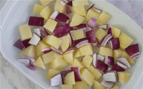2个土豆切块(大小适中),用沸水焯熟,沥干备用;洋葱切小块(不要太碎)备用;