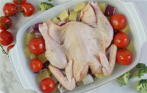 取一个烤盘,将焯熟的土豆、生洋葱铺在底部,将鸡摆上去,接着再放入洋番茄(没有的话可以用圣女果代替)。将剩余10ml生抽薄薄地刷在鸡的表面,蔬菜上也薄薄地刷一层橄榄油;最后再整个撒一点研磨黑胡椒粒;放入烤箱中层,200℃上下火,热风循环烤35分钟;(烤鸡是不需要预热的,放入烤箱后直接烘烤即可)