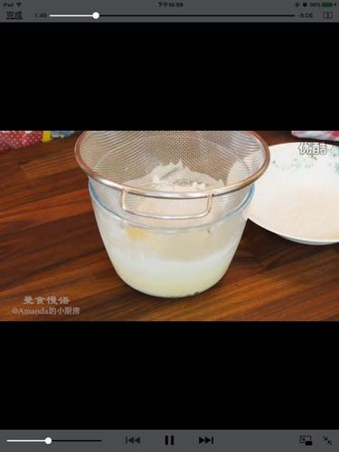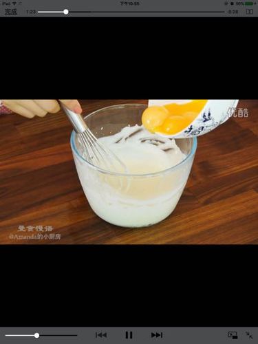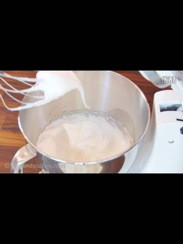 在面糊冷藏得差不多时打发蛋清,往蛋清中加入一半砂糖,中速打发至起粗泡,然后高速继续打发,再加入剩下的一半糖,打发至湿性发泡即可,这时蛋清还有一定的流动性,烤箱预热160℃;