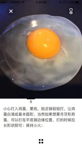 小心打入鸡蛋,要低,贴近锅轻轻打,让鸡蛋白滴成基本圆形。保持小火。(当然,如果想要月牙形的鸡蛋,可以打在平底锅边缘位置,打的时候拉长形状即可。)