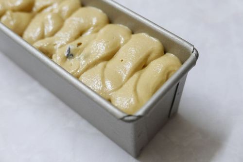 把面糊装入裱花袋,挤入刷了黄油的磅蛋糕模,磕几下面糊,排出气泡