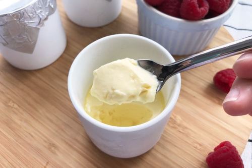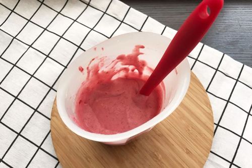 与此同时准备覆盆子慕斯的材料:先将吉利丁片用冰水泡发,并将覆盆子打成果泥备用。根据果泥的甜度,添加少量砂糖调味。