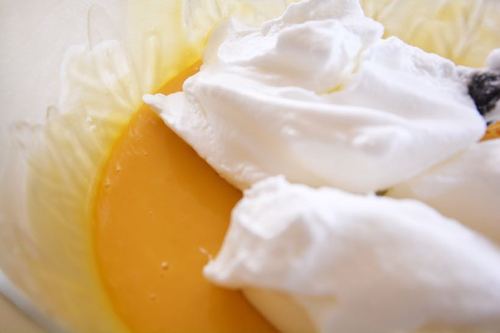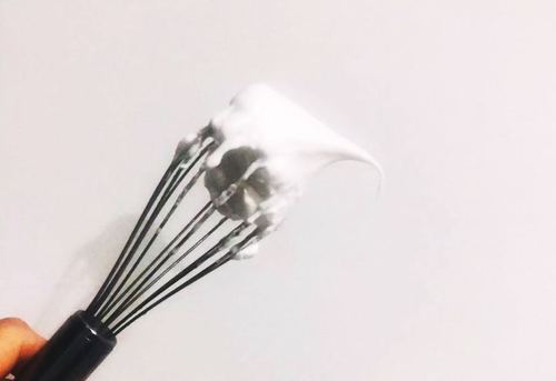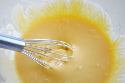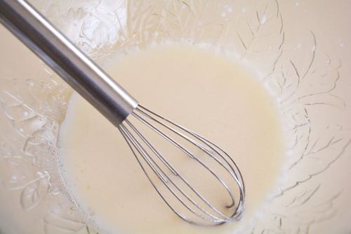迅速地拿出蛋抽,赋予它力量吧!!!左手90°转盆,右手蛋抽“之”字型搅拌,使玉米油与椰汁充分混合