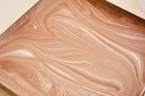 取200g拌匀的蛋糕糊,倒入巧克力咖啡糊中,翻拌均匀,装进一次性的裱花袋中,剩余的蛋糕糊倒入金盘中,均匀覆盖,可用刮板辅助铺平,桌上震一两下,震出气泡将巧克力咖啡蛋糕糊均匀地挤在原味蛋糕糊表面(也可以在原味蛋糕糊上画间隔线条,但是可能最后纹路会有变化)