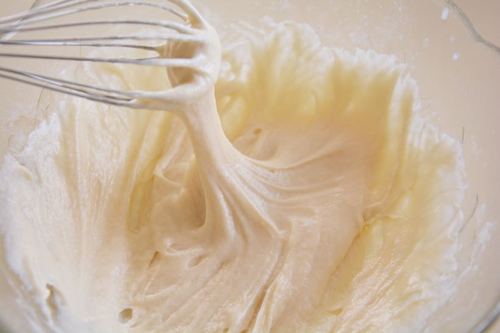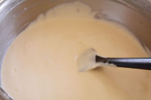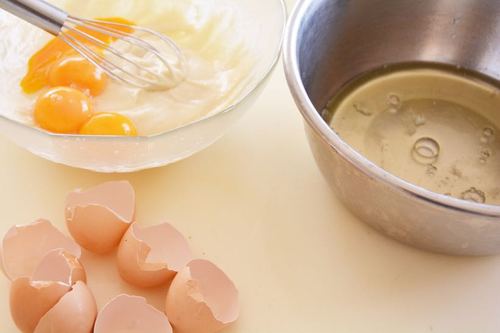 将加了蛋黄的面糊拌匀,直至顺滑无颗粒(对对对,还是左手转右手拌)