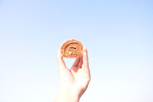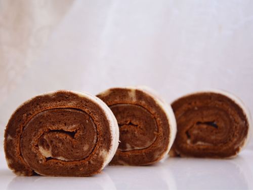 烤好后,震出热气,放凉,开卷卷的时候,正卷反卷都行(我使用反卷,毛巾底),尾端上部分斜切1cm左右,卷好后,两端油纸扎紧,定会儿型即可(因没加奶油,可不冷藏)切片吃,抱着吃,都可以ฅ^._.^ฅ