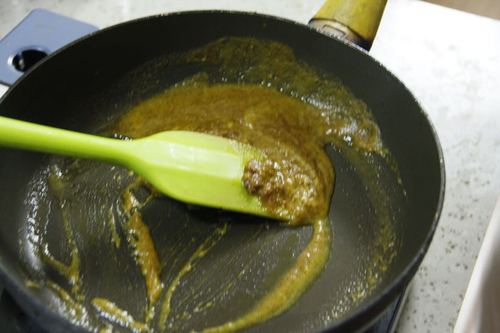 将一大勺植物油放入锅中,小火烧热,放入两块咖喱、一个奶油小方(超市买的好侍百梦多咖喱和奶油小方)