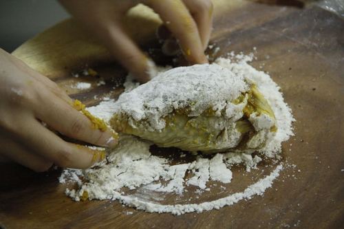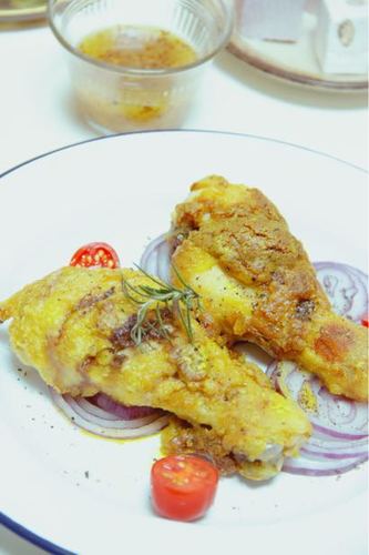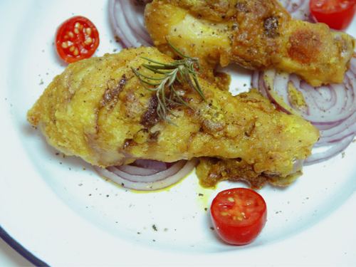 在面粉中加入少许盐和黑胡椒碎搅拌均匀,将腌制好的鸡腿在面粉中滚一圈,使鸡腿表面均匀的沾上面粉,鸡腿放入垫有洋葱的烤盘中