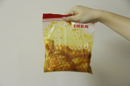 将鸡腿和炒好的咖喱酱放入密封袋,摇晃均匀放入冰箱冷藏室腌制一晚(4_6小时也可)