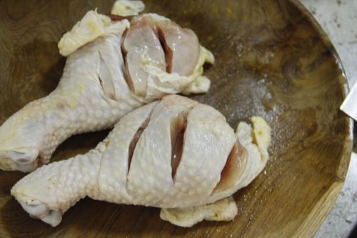 鸡腿肉斜切两三刀,撒上一小撮盐,按摩静置十分钟