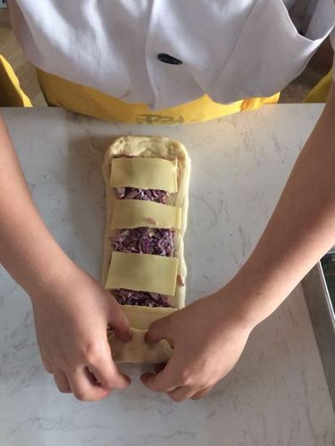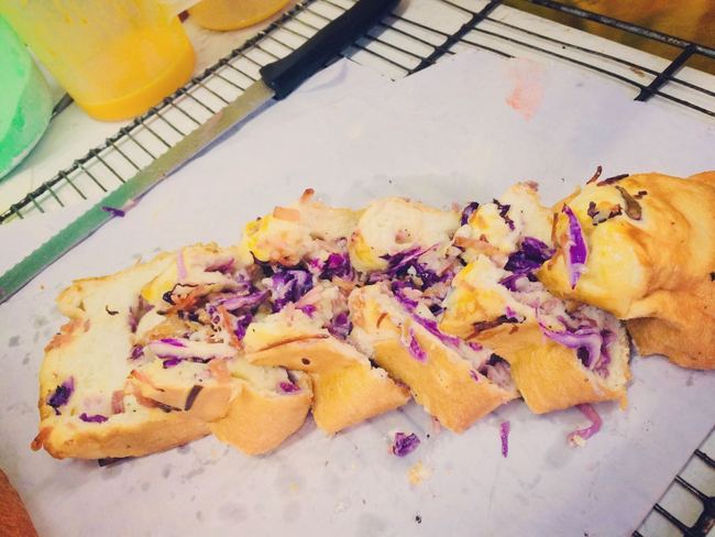 面上刷上全蛋蛋液,放上紫甘蓝丝培根丝,马苏里拉芝士,挤上沙拉酱 进炉
