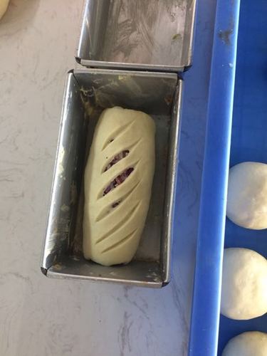 将250g的二次醒发好的面团搓圆再稍稍搓长一点,用擀面杖擀长放上馅,再铺上芝士片,卷起 放入抹好黄油的吐司盒中表面划几道口子,发酵