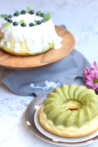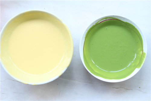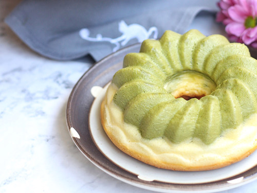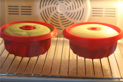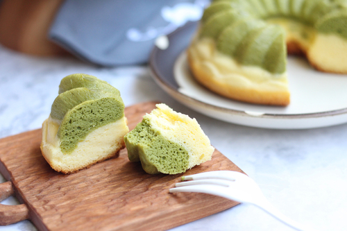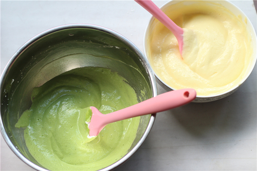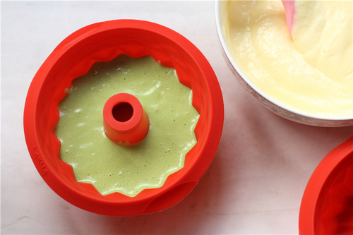 抹茶易变色,所以放在下层:先倒入抹茶面糊到模具一半高度,再倒入原味面糊,抹平表面;