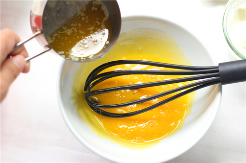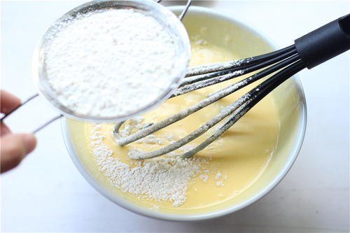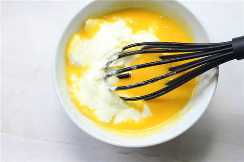 蛋黄打散后加入融化的黄油搅拌均匀,黄油温度不能过高;然后加入酸奶,搅拌成蛋黄酸奶糊;