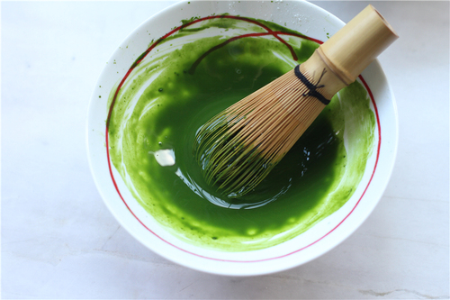 抹茶粉容易结块,所以先取一点点温水(15g左右)用茶筅将抹茶粉打匀成抹茶液;