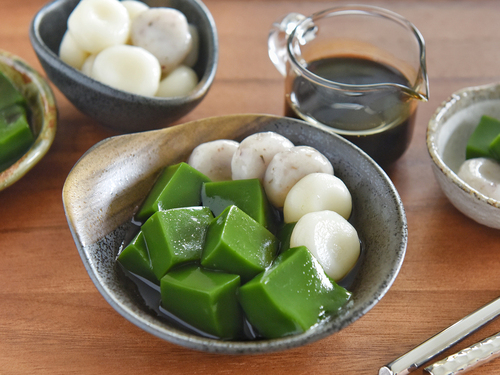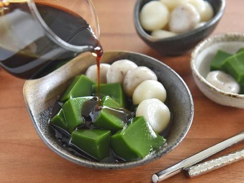 最后,凝固的抹茶冻用刀划拉成小方块,装进碟子里,摆几颗白玉丸子,淋上黑糖浆即成。清甜搭配微苦,不一样的春天味道。