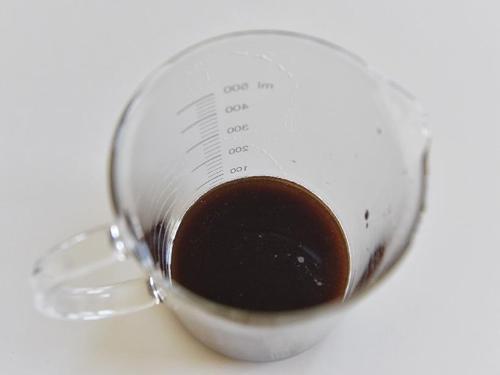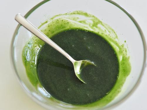 把水称在一个量杯之类的容器里,先在抹茶和糖的混合物里倒入一点,调成浓浆,如果有明显的抹茶颗粒就碾一碾。再倒下大约一半的水,混匀备用;剩余的水备用;