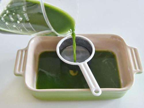 泡软的吉利丁片拿起来,沥干水分放入剩余纯净水中,微波炉稍稍加热到明胶片融化,记得不要加热到滚开,会冒出大量泡泡。把吉利丁液和抹茶液混合之后,用最细的筛子过滤,倒进容器里,放冰箱冷藏凝固。图片上是17×10cm的方形烤皿,凝固后可以切成效果图上那样的厚度约1.2厘米的小块;