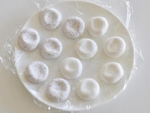 如果有干樱花碎,取一半面团揉进少许樱花碎。搓成大约8克一颗的小球,中心按一个凹坑;