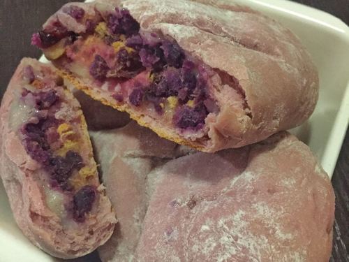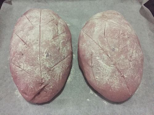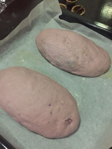 发酵好后筛粉割包,180度,预热好后,烤盘加盖锡纸烤20分钟左右(为了紫色)