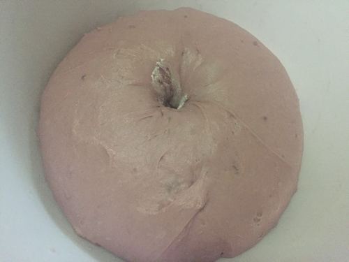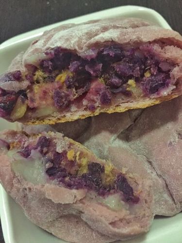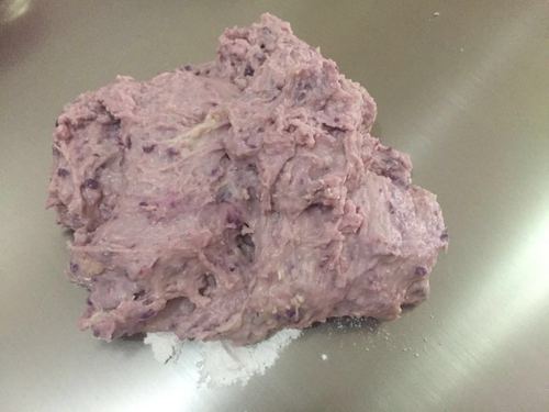 主面团:高粉250,紫薯泥100,盐2,糖30,酵母3,老面75,烫面25,牛奶160(视情况),拌匀揉至厚膜不完全扩展状态(加鸡蛋就没有紫色了;油糖占总比不超过10%)