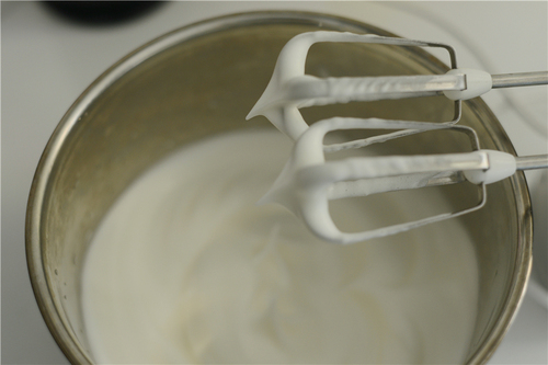 一边用电动打蛋器中速打发蛋清,一边将40克白砂糖分三次加入到蛋白糊,打到提起打蛋器蛋白呈直立小勾状态,如图!