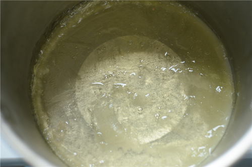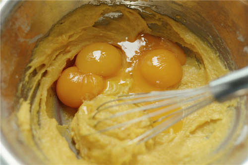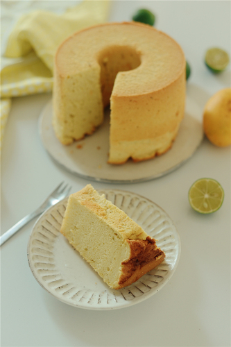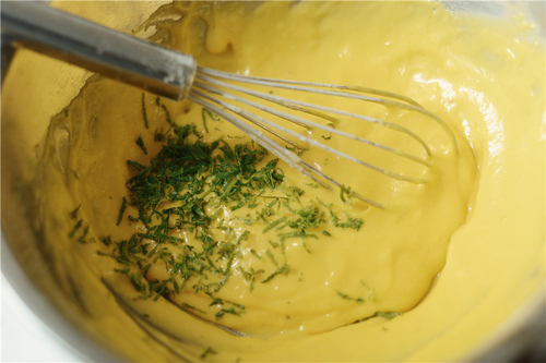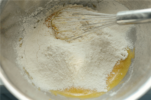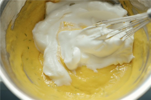 倒入蛋黄,搅匀后加入青柠皮屑,继续拌匀,蛋黄糊就做好啦。