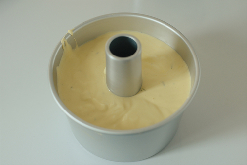 从距离模具约15-20cm处将蛋糕糊倒入,避免大气泡,倒完后可以轻震几下模具,将大气泡震掉;