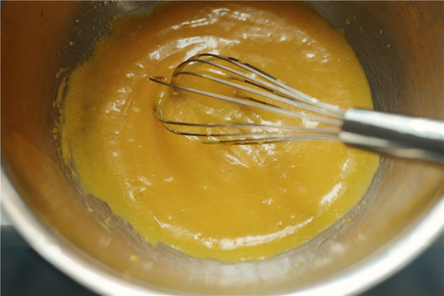 混合油和20克砂糖,加入芒果泥搅拌均匀;筛入低粉,用蛋抽呈“z”字形搅拌均匀;