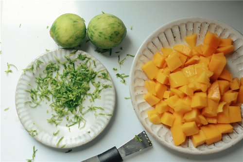 青柠洗干净将皮刨成屑,我的青柠比较小所以用了两个,正常一个就可以啦!芒果肉切成丁;