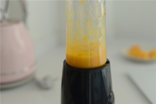榨出10克青柠汁,连同芒果肉放入料理机打成奶昔状的果泥;
