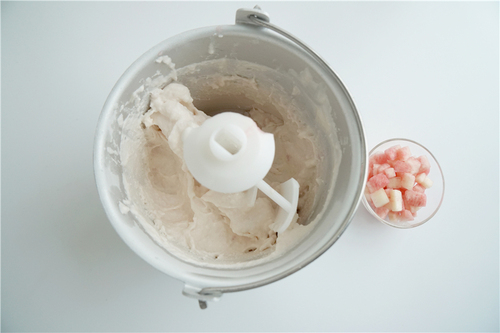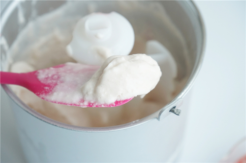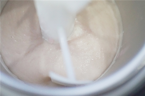 将小果粒以外的所有材料混合倒入冰淇淋桶中,开动冰淇淋机;