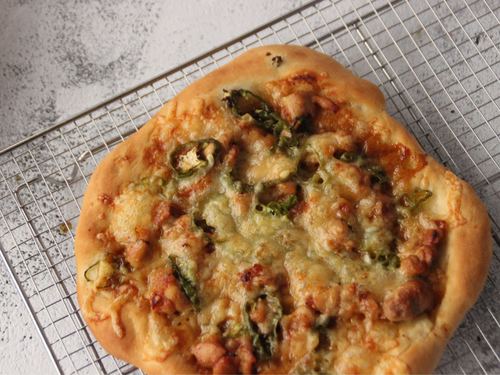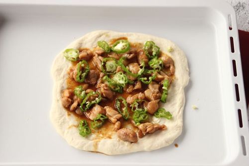 上面放上鸡腿肉,切成圈的青椒。放上适量马苏里拉奶酪。