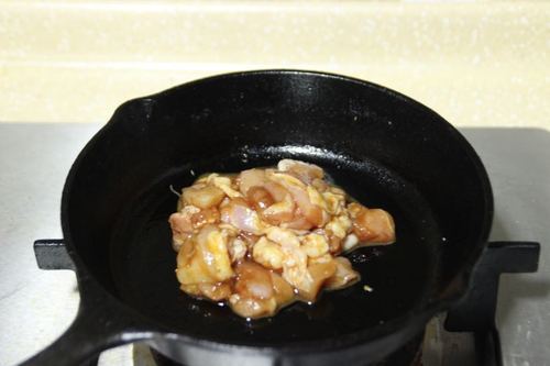 此时准备披萨料:鸡腿肉加烤肉酱拌匀,全部放入锅里,炒到鸡肉变色即可。