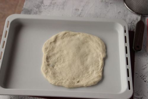 披萨底做好后,取出,室温下醒发10min,然后用手握着面团边缘撑圆,成为堤岸状的边。