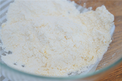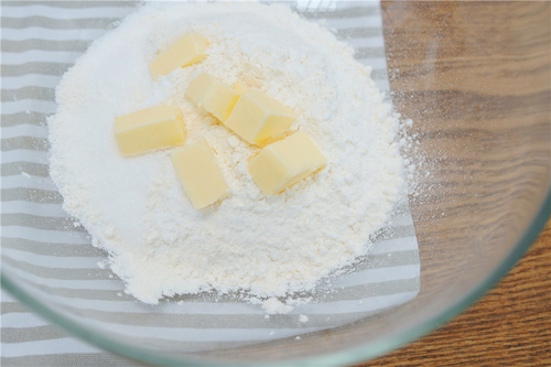 用手指将黄油捏扁,再用手掌对搓成肉松状。注意:尽量保持黄油比较低温,为了避免手温过高,可以事先手放凉水里变凉; 室温超过26度,最好开空调;