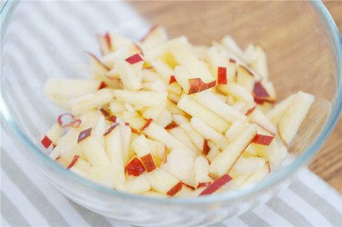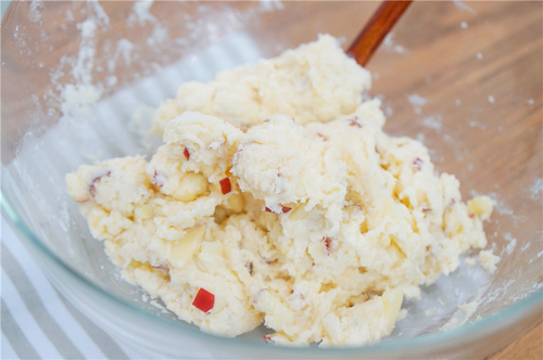 把苹果丝拌入准备好的面粉堆中,加入3/4牛奶,用刮刀切拌混匀,有干粉的地方就再加点牛奶拌匀;