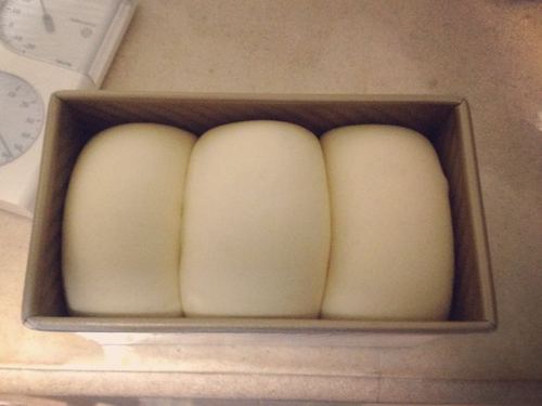 高筋面粉,糖,盐,酵母,液体(鸡蛋和其余液体)放进厨师机,揉面到扩展状态。 加入软化后的黄油,揉到完成状态。 三等份,擀开再卷起来,直接丢进模具一次发酵。 不同面粉需要的水量不同,如果面太干了可以多加点水,总之自行调整!