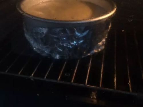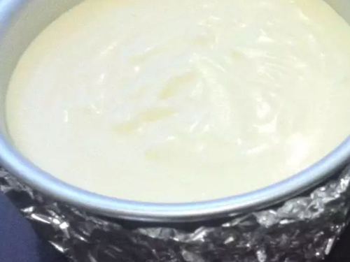 (隔水蒸)将模具底部包入锡纸,边上刷点黄油,将奶酪糊倒入模具中,震两下进行消泡。