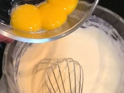 蛋黄5个,依次加入搅拌好的奶酪糊中,速度要快,以防蛋黄熟