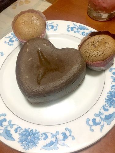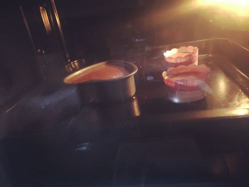 倒入模具中,因为用的是心形的模具所以只能把多的倒纸杯中。上火150、下火150,预热后放入烤10分钟(以实际烤箱脾气为准)