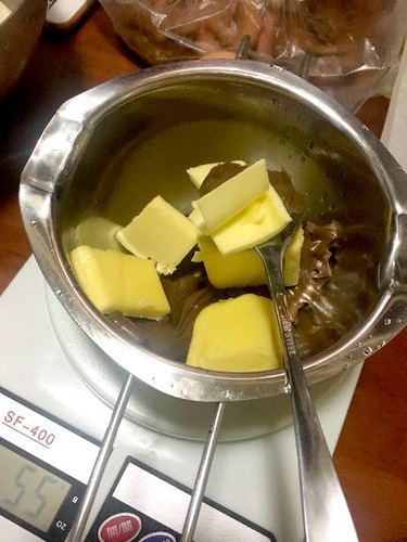 巧克力60g、黄油55g加热软化后搅拌均匀