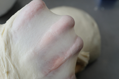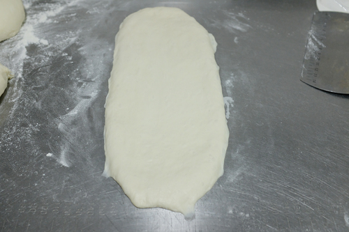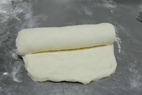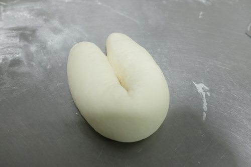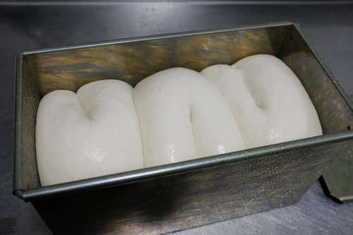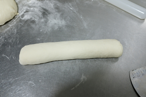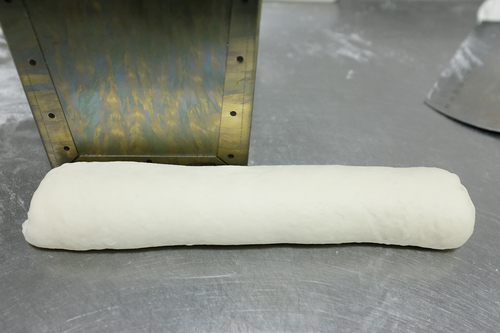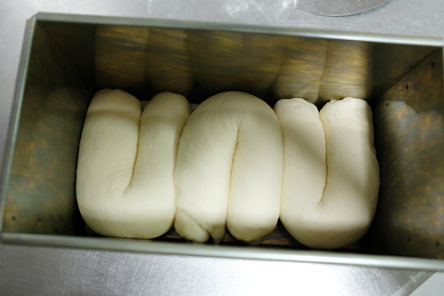 全部操作完成后醒松弛10分钟,搓长,长度需保持在吐司盒长度的2倍即可,将面团弯过来,呈现u型,全部操作完成后摆入吐司盒中;