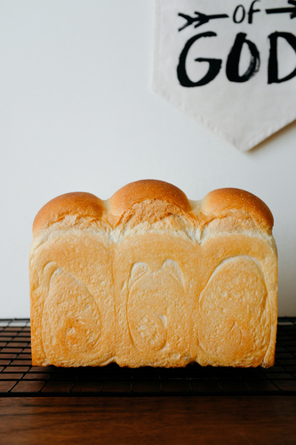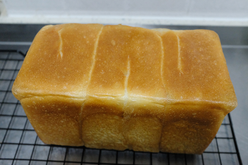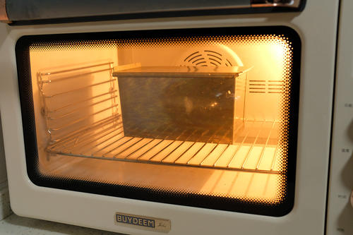 差不多发酵结束前取出吐司盒,拿掉发酵盘,预热烤箱上下火190℃,预热完成后,吐司盒加盖放入烤箱下层,转180℃烤47分钟;