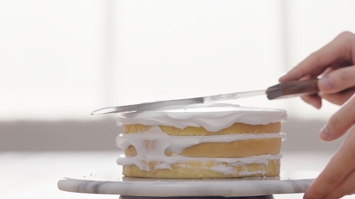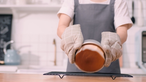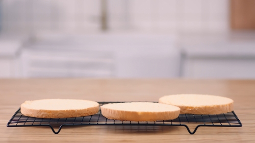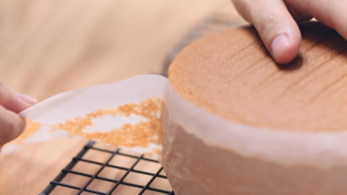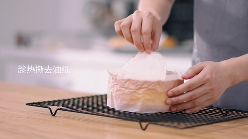出炉后将蛋糕直接倒扣在晾网上,先撕去底部油纸,翻转后正面朝上撕去一圈围边;最好是按这个顺序来撕,也最好是顶部朝上放凉。因为先撕去围边,只能用手套扶着蛋糕翻转,比较不卫生;如果顶部朝下直接晾凉,会让顶部本身膨出来的部分组织压得过实;