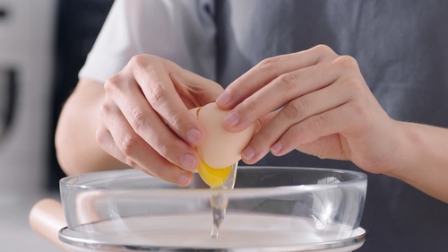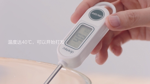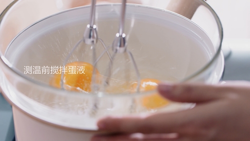 打蛋器低速将蛋液打散,并保持测温,蛋液温度到达40℃即可离火;