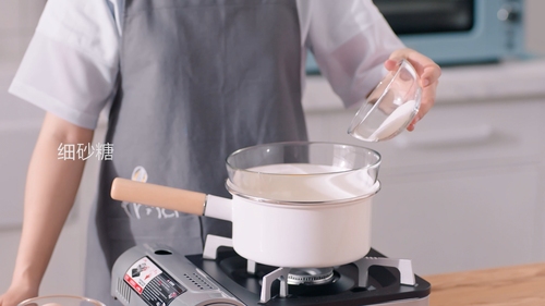 用一个中号奶锅,倒入大概1/3体积的水量,放在卡式炉上,坐一个蛋盆在奶锅上,要确保蛋盆底部不直接接触水;