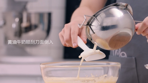 融化的黄油牛奶离水降温,低粉筛入全蛋液中,轻柔的翻拌均匀;如果是新手,建议将面粉分两次加入翻拌,会更容易拌匀,即使手法生疏也不怕哦~