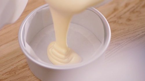 将黄油牛奶顺着刮刀背慢慢倒入,让黄油牛奶尽量均匀的流平在蛋糊表面,便于后续的翻拌,因为黄油会让面糊明显消泡,直接倒入就全部沉底啦;翻拌均匀后将蛋液倒入铺好油纸的模具中;