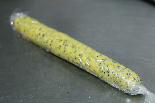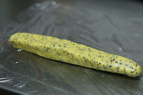 在操作台上铺一层保鲜膜,把面团轻轻搓长,整理成长条略正方的形状;用保鲜膜将面团卷起,搓成圆筒状,放入冰箱冷藏至少6小时;